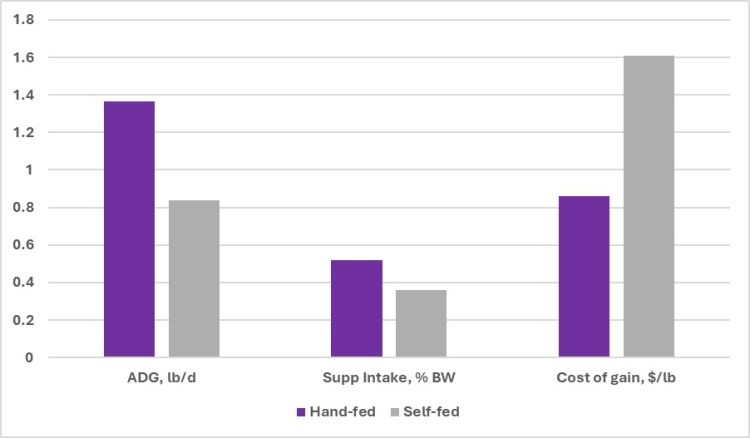 The use of self-fed tubs can be more convenient than daily hand-fed supplements but may increase the cost of gain primarily if intake of the self-fed tubs are less than expected. If hand-fed supplements are not a viable option, ensuring adequate intake of self-fed tubs is necessary. To ensure adequate intake, be sure that cattle are not overstocked relative to tub availability (number of animals per tub) and that tub hardness is optimal for the targeted consumption. Tub intake should be monitored by recording tub weight, the date that new tubs are placed in the pasture, the number of heads in the pasture, and the date that the tubs are empty. Average daily consumption can be calculated using the following formula: