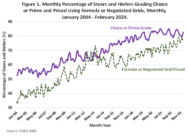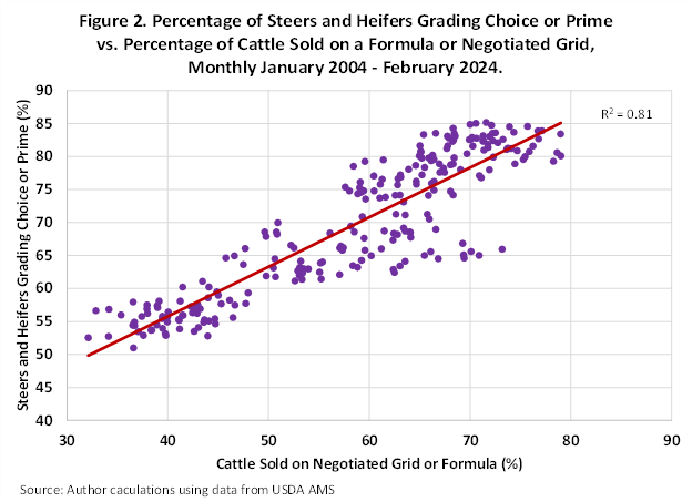 The association between formula and negotiated grid pricing and enhanced beef quality grade is obvious from Figure 1 and shown even clearer in Figure 2 where the percentage of steers and heifers grading Choice and higher are charted against the percentage marketed using formula or negotiated grids. The correlation between percentage of beef grading Choice and higher and grid pricing prevalence is 90%. This is resounding evidence of causality as market premiums offered producers through grid pricing, incentivized enhanced quality beef production.