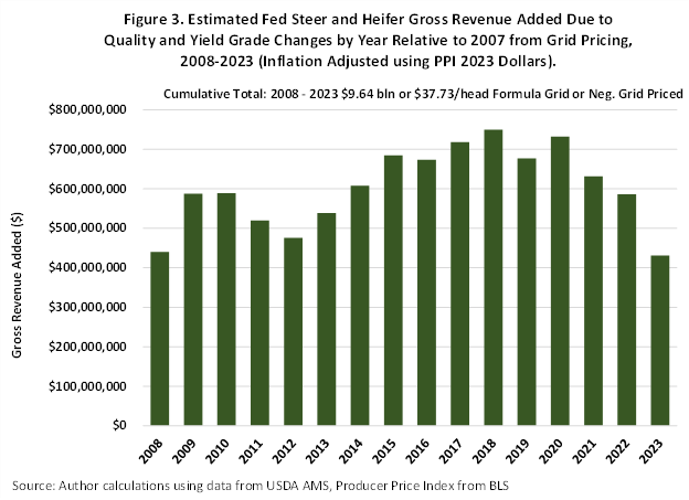 With that calculation briefly described, Figure 3 shows the gross revenue added to beef cattle feeders each year relative to 2007 from just changing the production mix of quality and yield grades over time together with the actual market premiums and discounts received. The differences across years are associated with changing quality and yield grade distributions (quality grade mostly improved with more Choice and up graded beef and yield grades tended to numerically increase modestly as longer days on feed and heavier cattle weights occurred over the years). The estimated total gross revenue added to producers bottom line from 2008-2023 was $9.64 billion or just under $38/head for steers and heifers sold on a grid. This is likely a conservatively low estimate as although it ignores more potential discounts associated with heavy-weight carcasses, it also ignores premiums for special program (branded) specifications well as certified upper Choice grades. Any added costs producers incur to produce and market steers and heifers on a grid are not included and would be needed to convert the gross revenue to a net return impact.